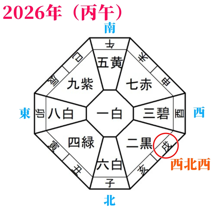 という感じで、午年の今年は、寅月(2026年2/4〜3/4)に戌の方位に行くと吉方位になります。