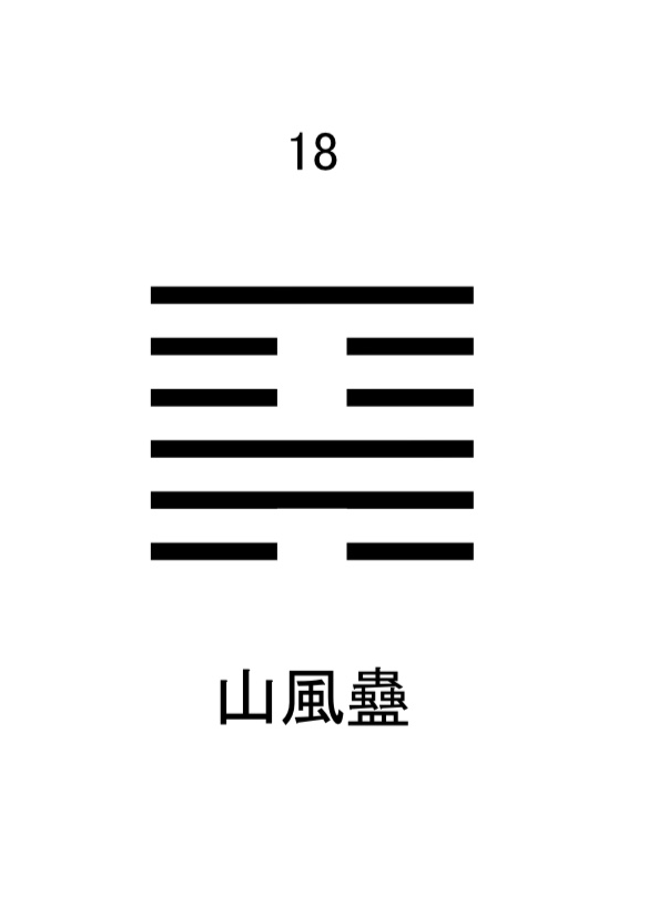 「蠱」って字は皿の上に虫が3匹という造りで、想像するとちょっとおぞましい・・・ウジがわいたみたいな感じ?さっさと片付けたいところです。もう腐っているのだから一掃しましょう、リセットだ!という卦です。