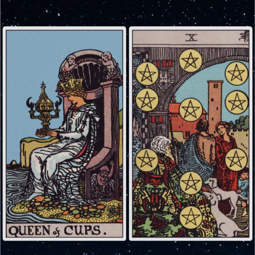 ペンタクルの10は基本的にはいいカードですが、占的や状況しだいで見え方(読み方)がかわりますね。いい悪いtで区切れないのがカードや易などの卜術の面白いところです。