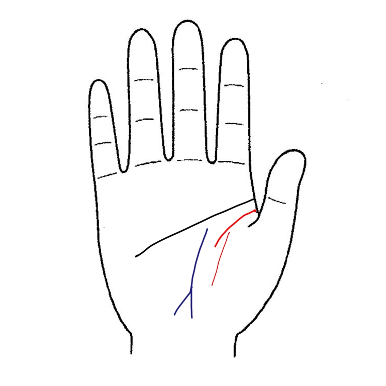 また、私の手の図解を見てもらうとわかりますが、手の中央を下から昇る運命線(紫色の線)が生命線を補うかのように出ています。